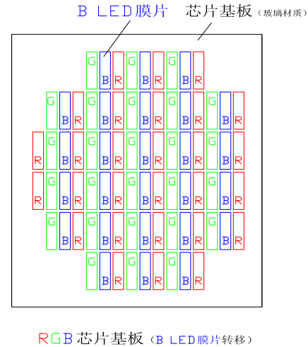 RGB芯片基板需要經(jīng)過(guò)三次(R、G、B)晶圓級(jí)規(guī)模LED膜片轉(zhuǎn)移。