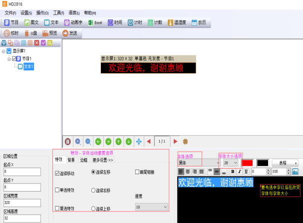1.3然后在右下角黑色區(qū)域打字、改變字體、和字體的大小,選擇走字特效即可(注:如果文字較多特效選擇連續(xù)移動、連續(xù)左移)