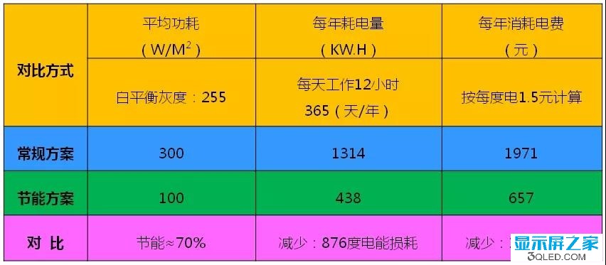綜合采用LED節(jié)能方案產(chǎn)品對(duì)比普通產(chǎn)品,每平米每年可節(jié)約876度電能,按1.5元/度電費(fèi)計(jì)算,每平米每年可節(jié)約1314元,如下表(采用P10-1平米進(jìn)行對(duì)比數(shù)據(jù)):4SvLED顯示屏廠家|江蘇迷你光電有限公司
