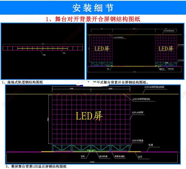 2、然后在軌道基礎(chǔ)上安裝屏體鋼結(jié)構(gòu),以屏體中間對(duì)開,分辨安裝2個(gè)鋼結(jié)構(gòu),如果只搭建一個(gè)鋼結(jié)構(gòu),那么另外一個(gè)屏體就不能形成統(tǒng)一性連貫,