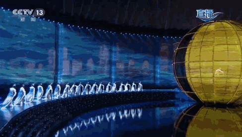 整個舞臺,真真再現(xiàn)了“海上升明月,天涯共此時”所描繪的美景畫卷,球屏上的月亮圓缺轉(zhuǎn)換,環(huán)幕中的海水潮漲潮落。演員們舞弄著水袖與燈光互動,唯美的海岸線城市景觀與當空明月相互輝映。讓人感受海之美,月之靈。
